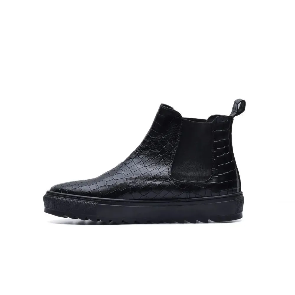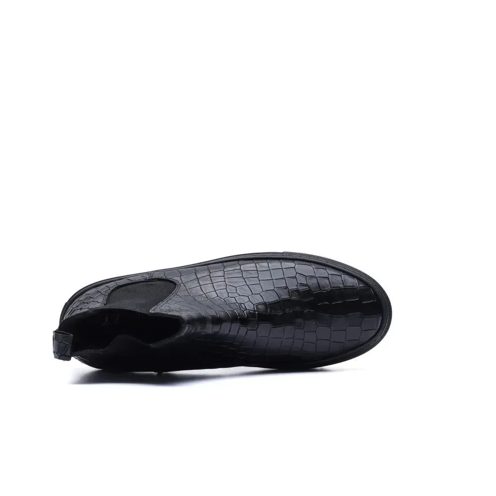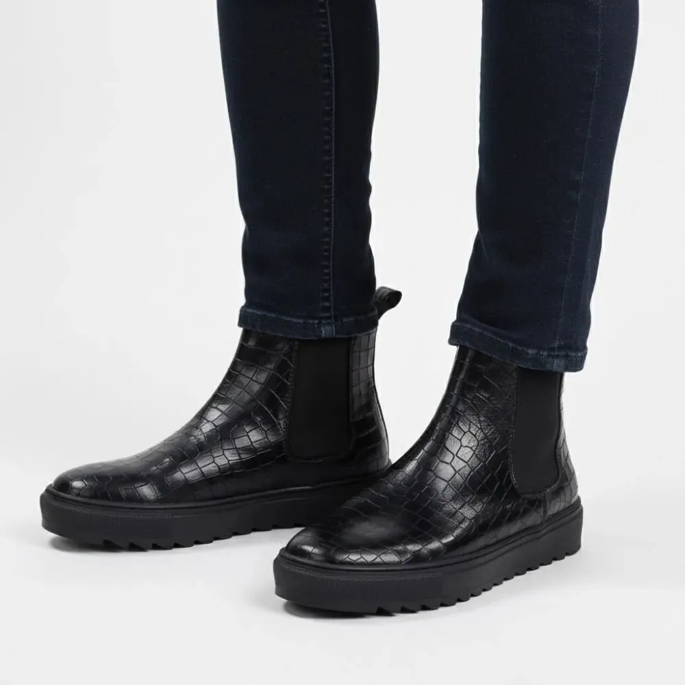 Made in Italy Chelsea boot in black leather with a deep crocodile print, for those who love to stand out with style. The reptile-patterned upper gives visual and material strength to the silhouette, while the serrated black rubber sole ensures urban comfort and personality. The tone-on-tone side elastic maintains the functional essence of the Beatles model, renewing it with a more street and decisive spirit.