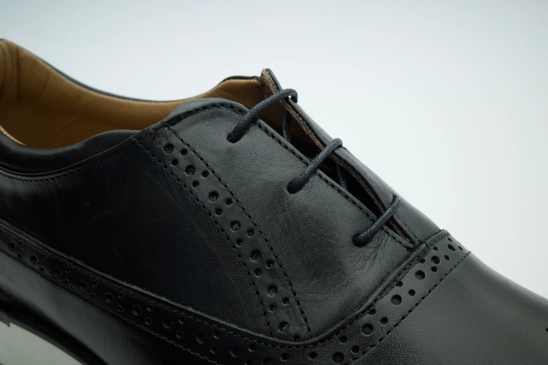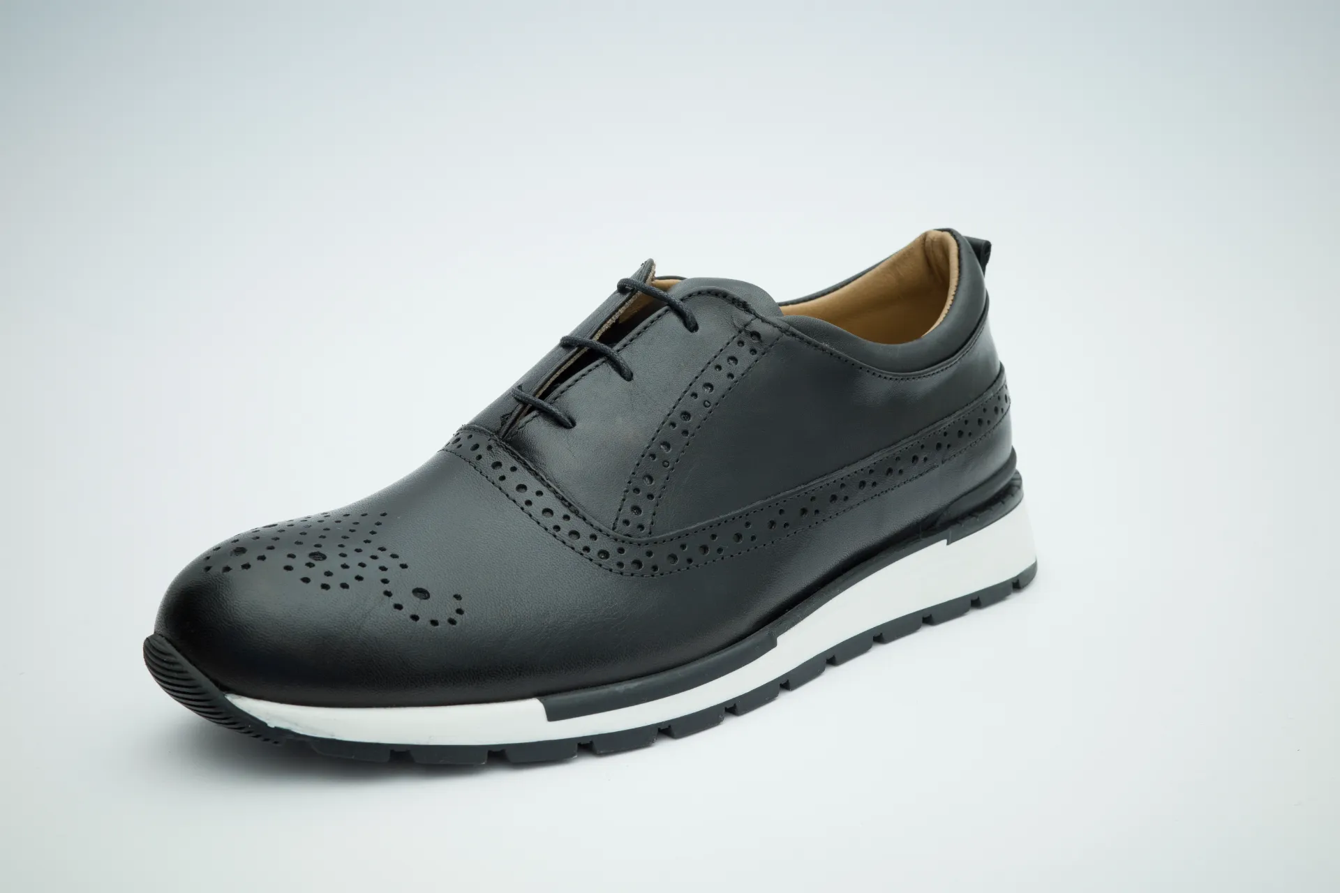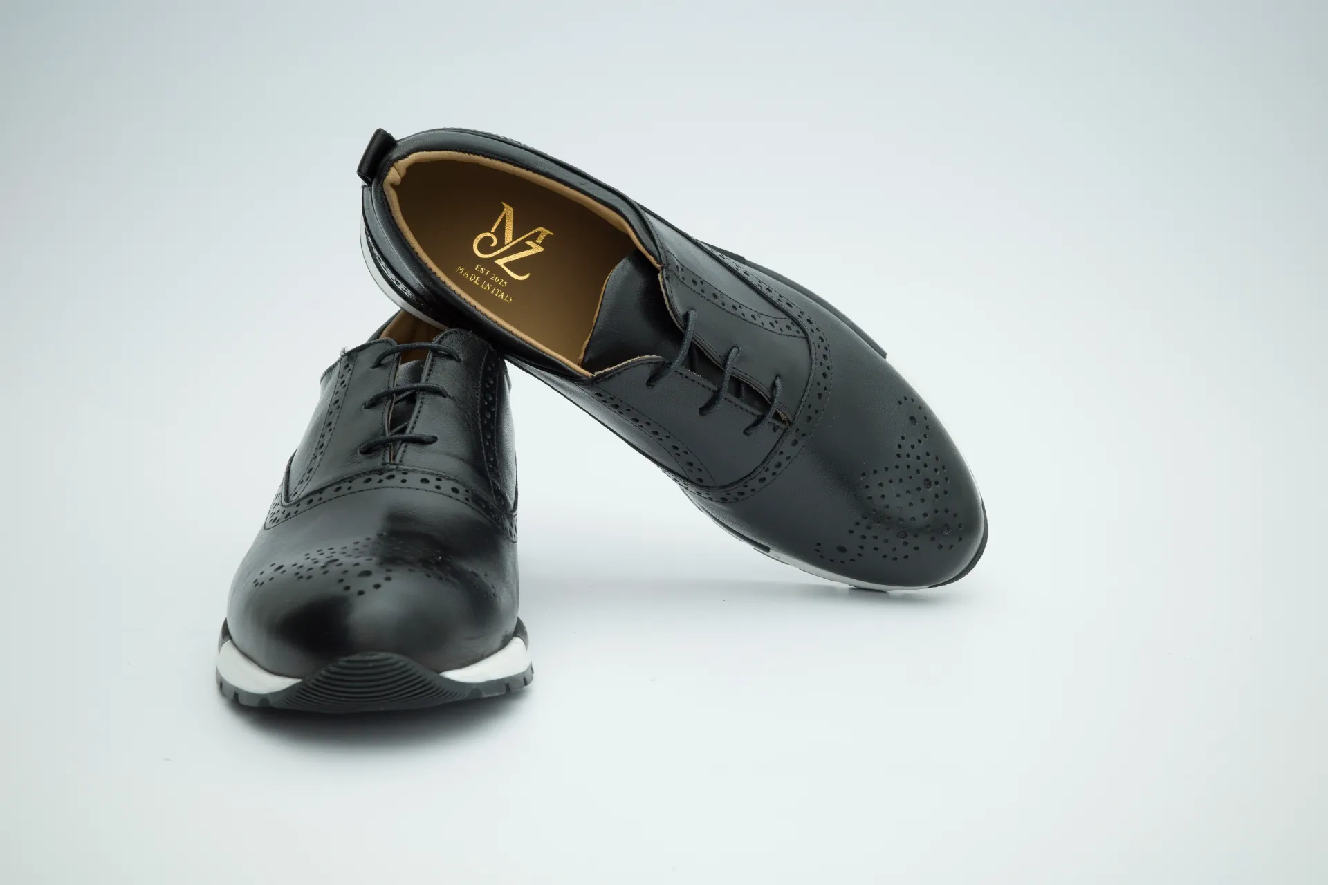 Handcrafted in Italy, this lace-up model reinterprets the timeless brogue design through a clean, modern silhouette. The smooth black calfskin upper is enhanced by precise perforated detailing on the toe and subtle brogue accents along the seams, offering elegance without excess. The interior is lined with premium natural leather in a warm tan tone, finished with a gold-printed MZ LXRY logo—an understated mark of craftsmanship and authenticity. A modern rubber sole with a refined profile ensures comfort, durability, and everyday versatility.
